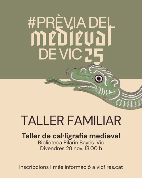 Taller de cal·ligrafia medieval a càrrec d'Ariadna Queralt. Amb càlam i tinta, els infants aprendran a escriure com en temps medievals, dibuixant cada lletra amb paciència i concentració. Una experiència lúdica i plena de significat, on l’escriptura esdevé història viva i cada traç, un petit gest de bellesa i calma. Taller per a públic familiar en […]
